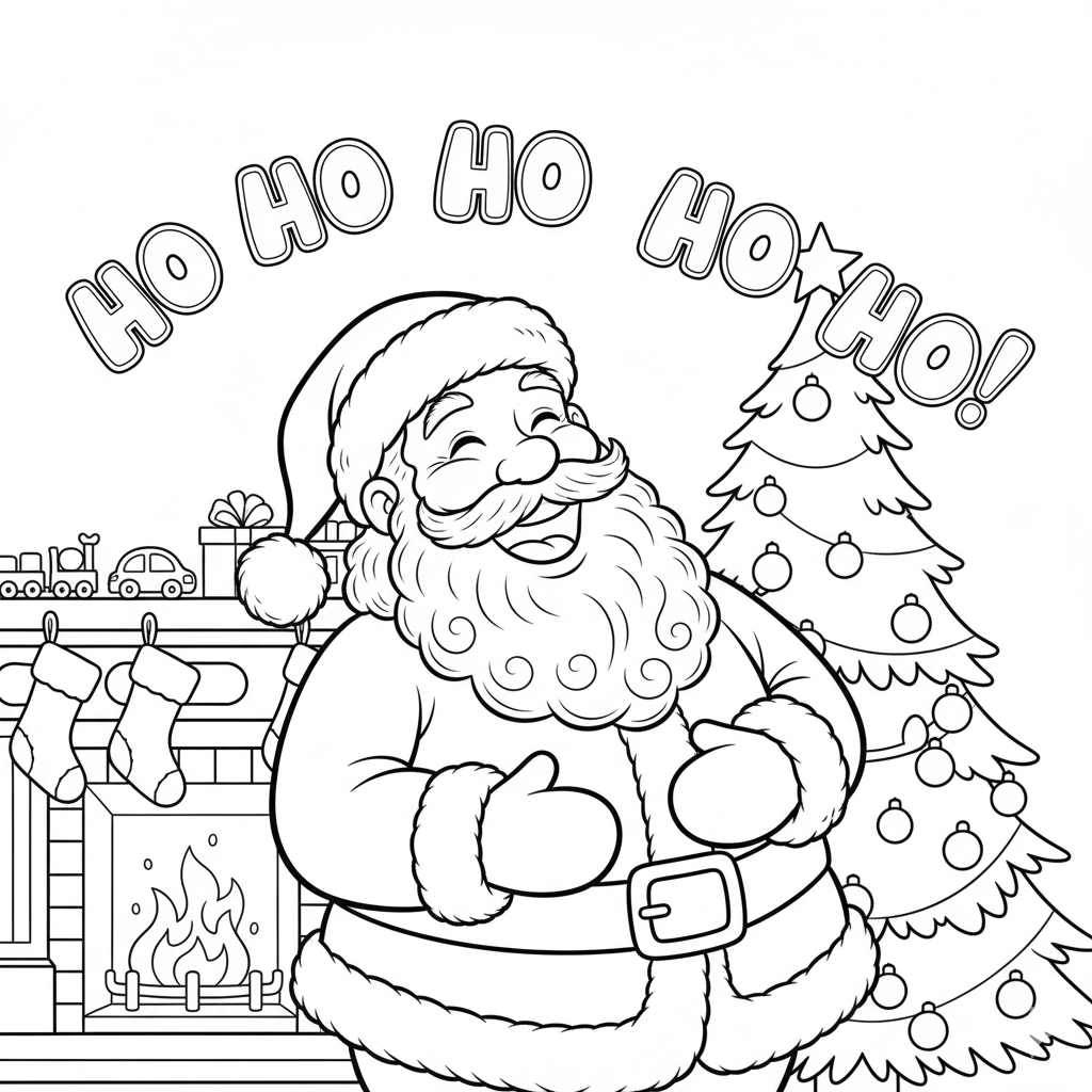 Black and white outline drawing of Santa Claus [doing something], cartoon/anime style, thick clean bold outlines, no shading, no background, simple composition, for kids’ coloring book, centered on page, plain white background.